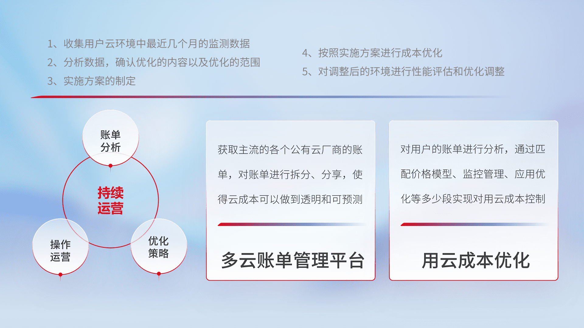 通过多云纳管,,,以统一的资源数据模型把客户的云资源进行抽象和封装,,进而实现对多云资源的统一操作,,,保障云资源管理的可靠性、、稳定性与可用性。。量身定制化运维内容,,配置、、、开发运维、、、、补丁管理、、、备份、、、、监控、、、、认证和访问管理、、、审计和日常巡检等,,保障在用云过程中的可靠度,,,稳定度以及高可用率。。。。